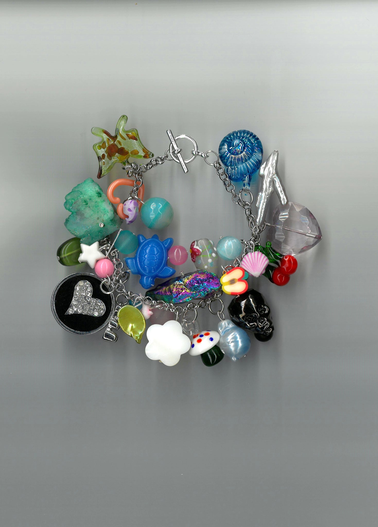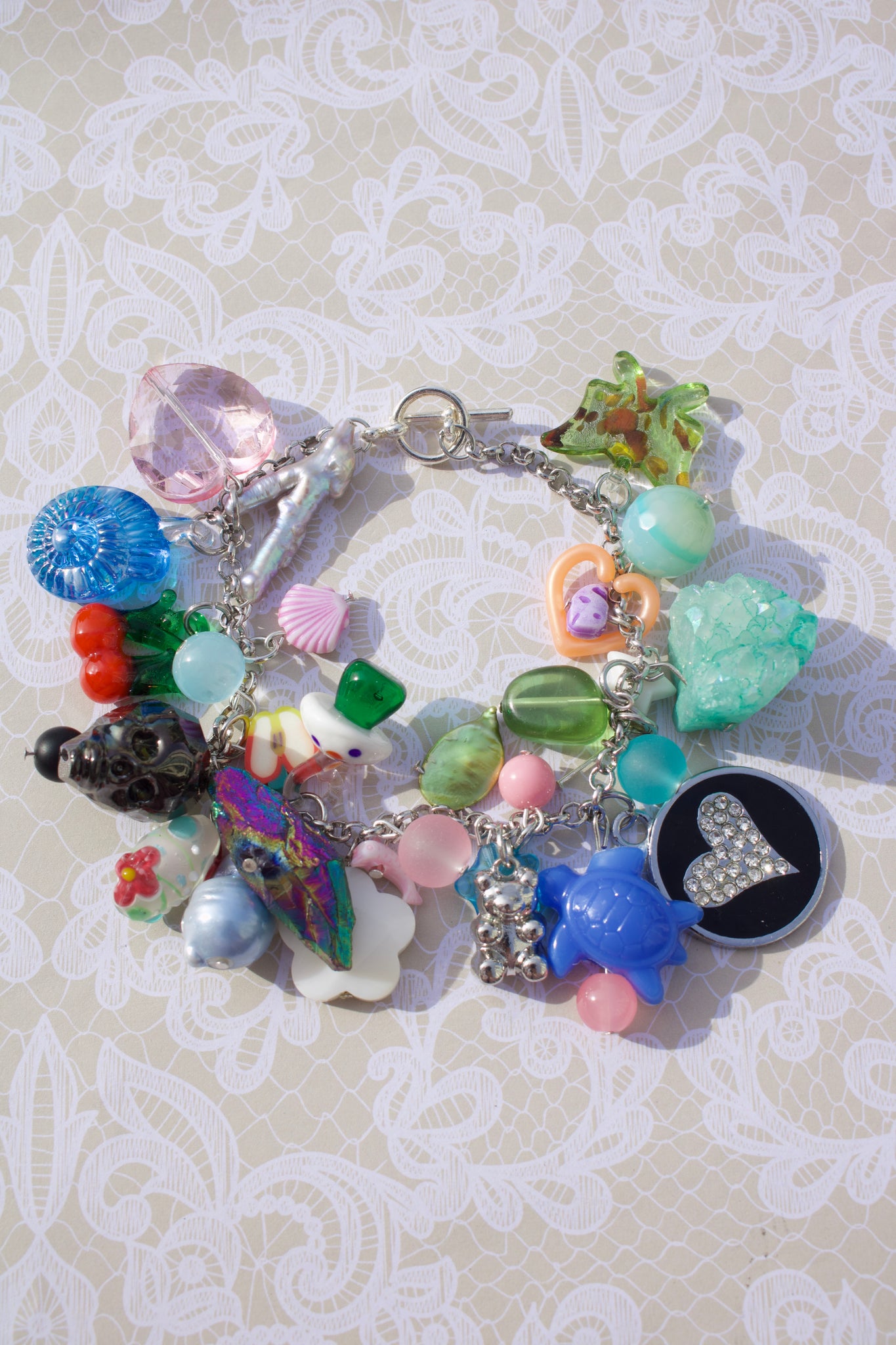 Charm bracelet featuring freshwater pearls, vintage glass charms, raw agate, and vintage Czech glass beads. 9 inches.ย